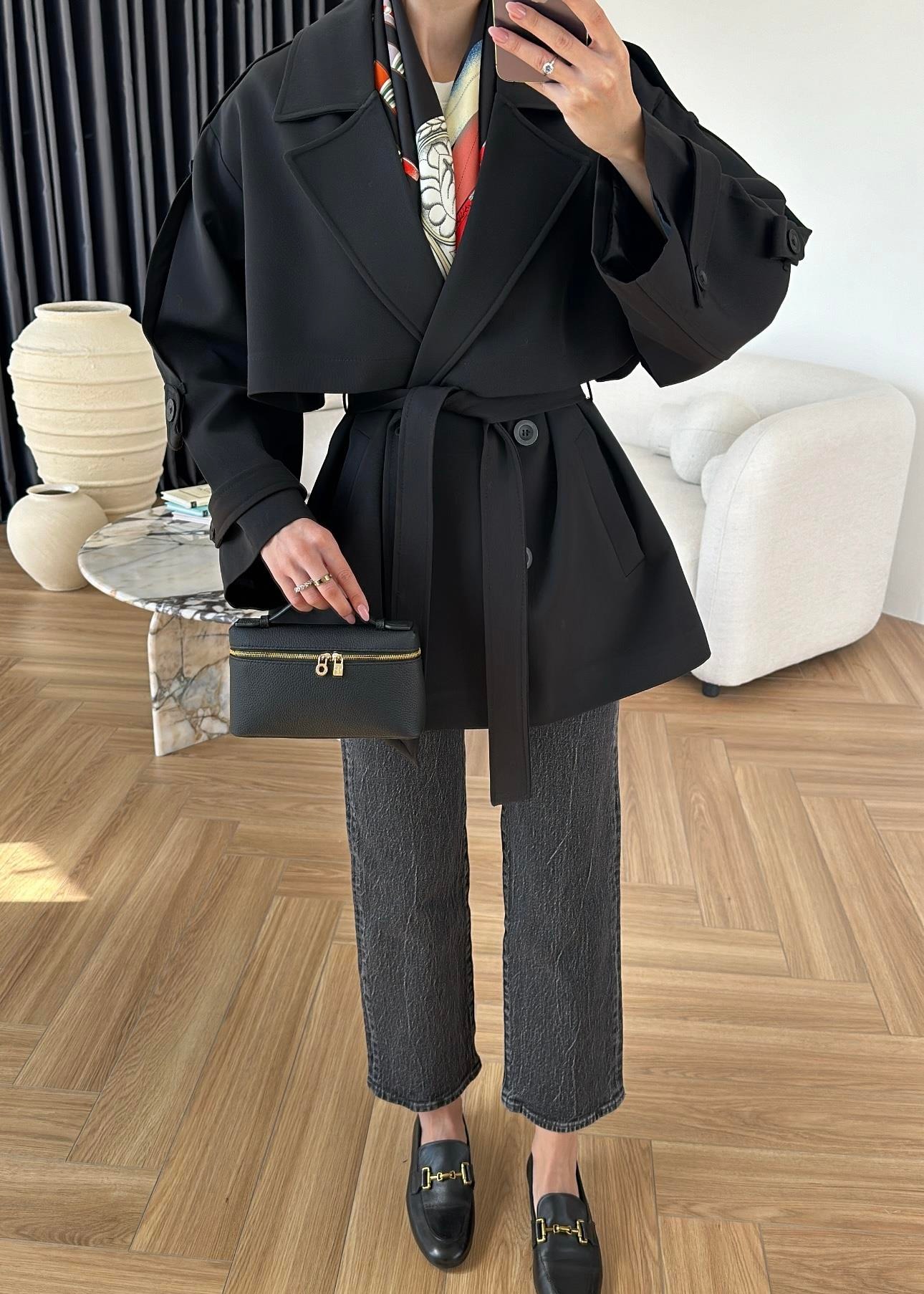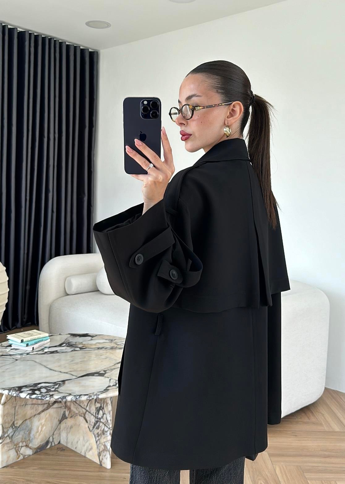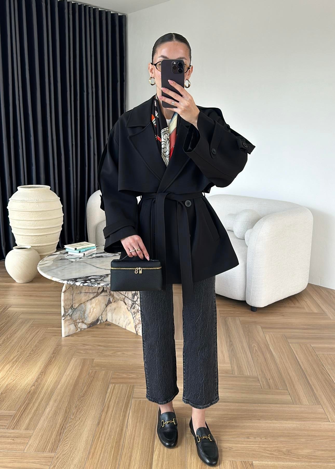 Rüzgarlıklı Ara Boy Trençkot SİYAH