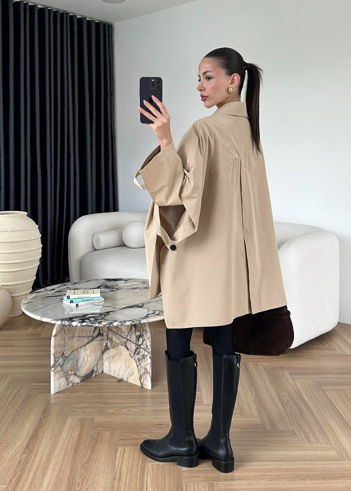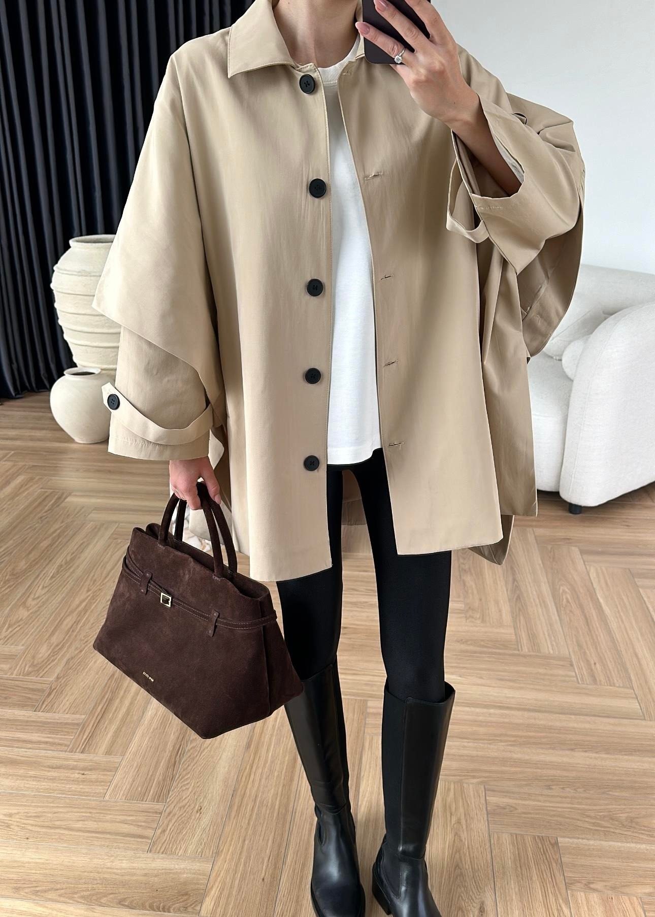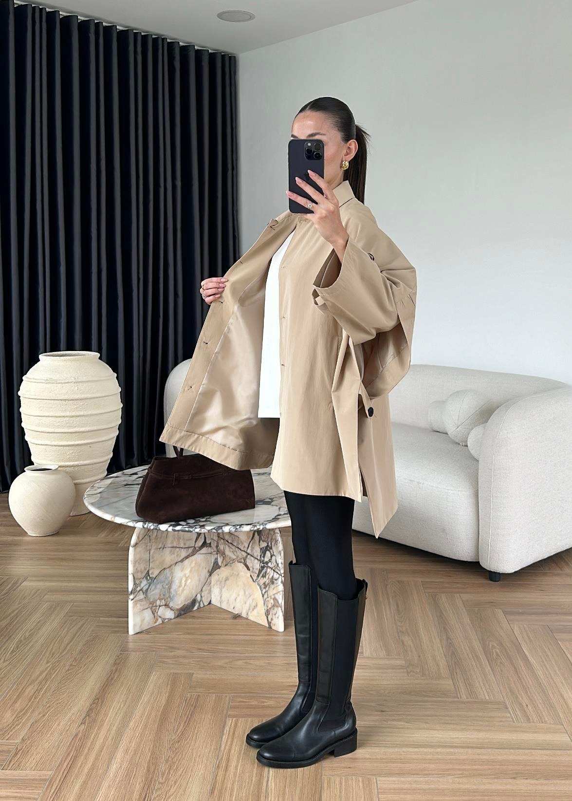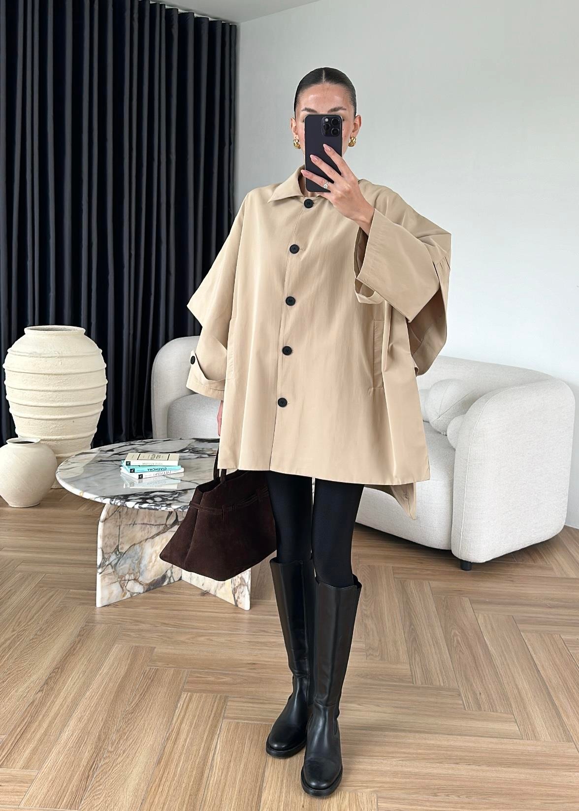 Uzun Kollu Pelerin Trençkot BEJ