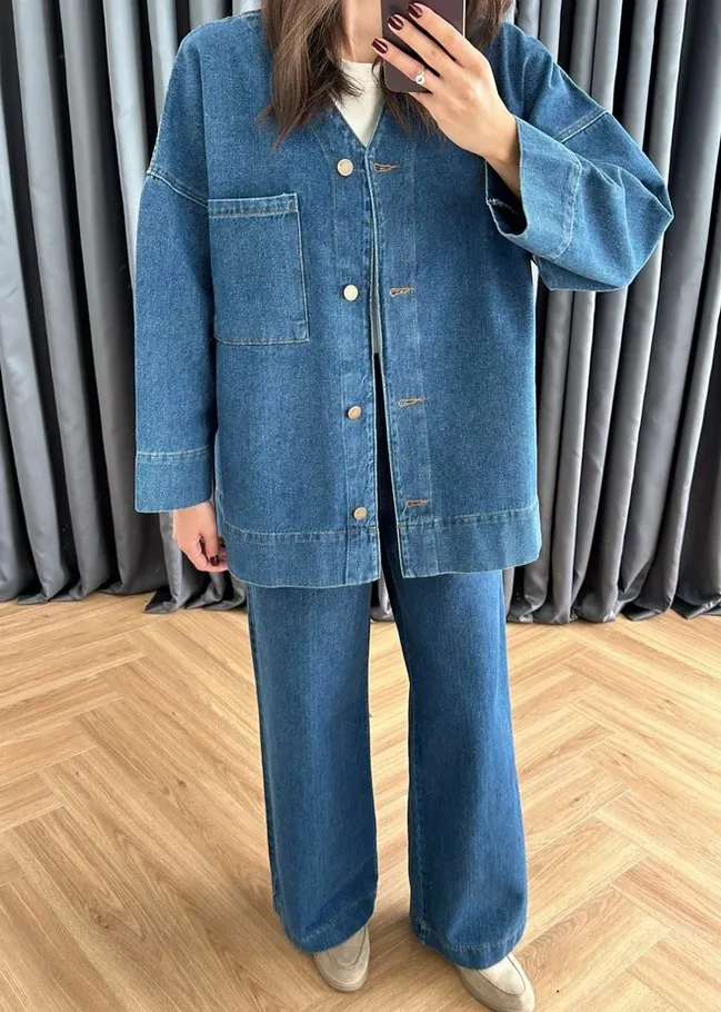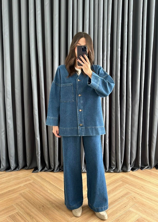 V Yakalı Denim Takım KOYU MAVİ