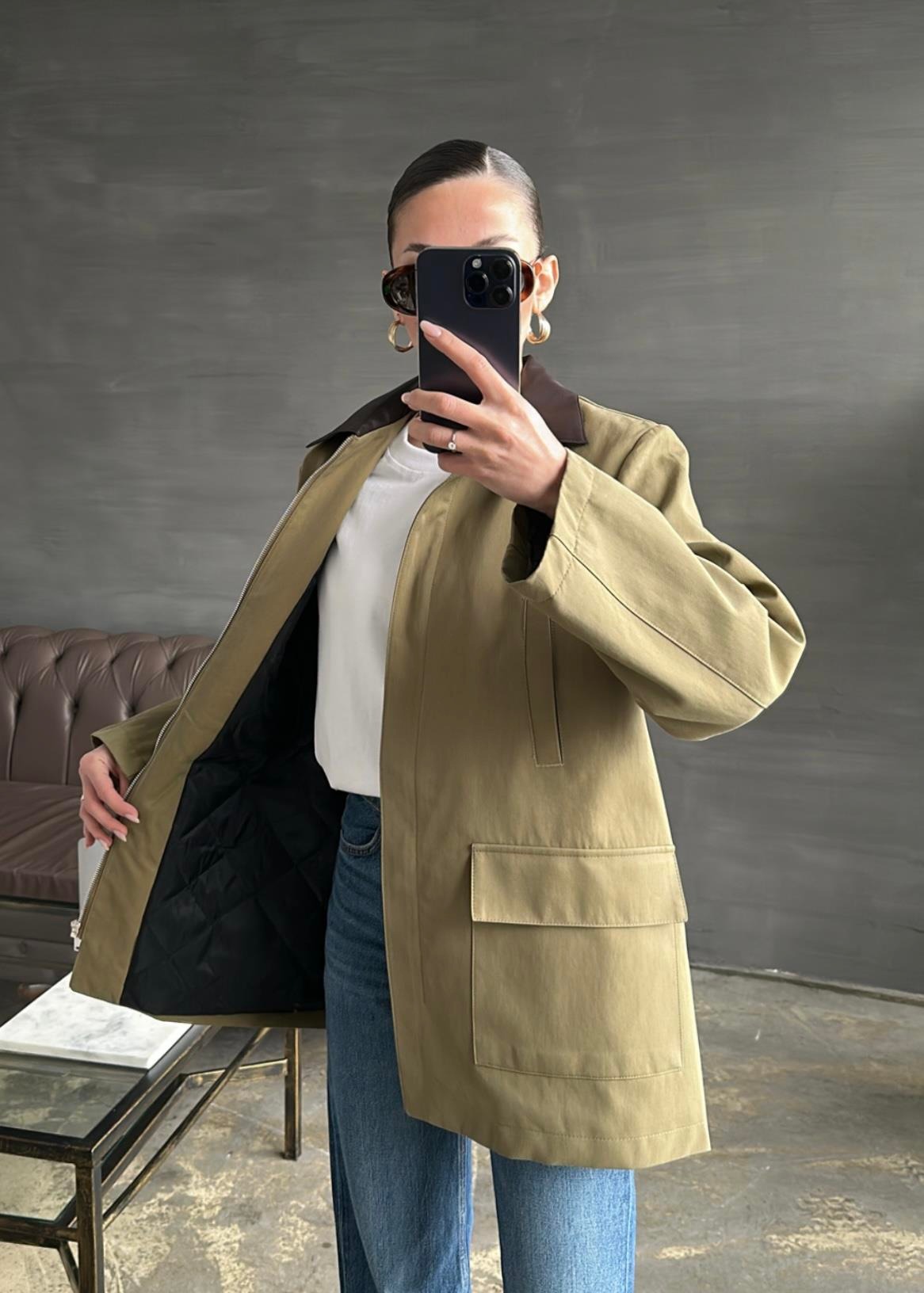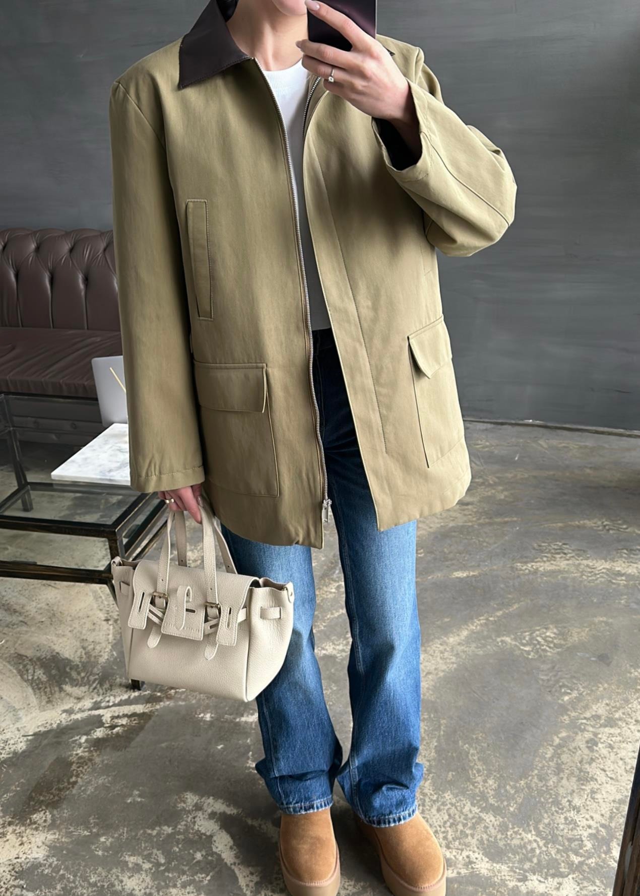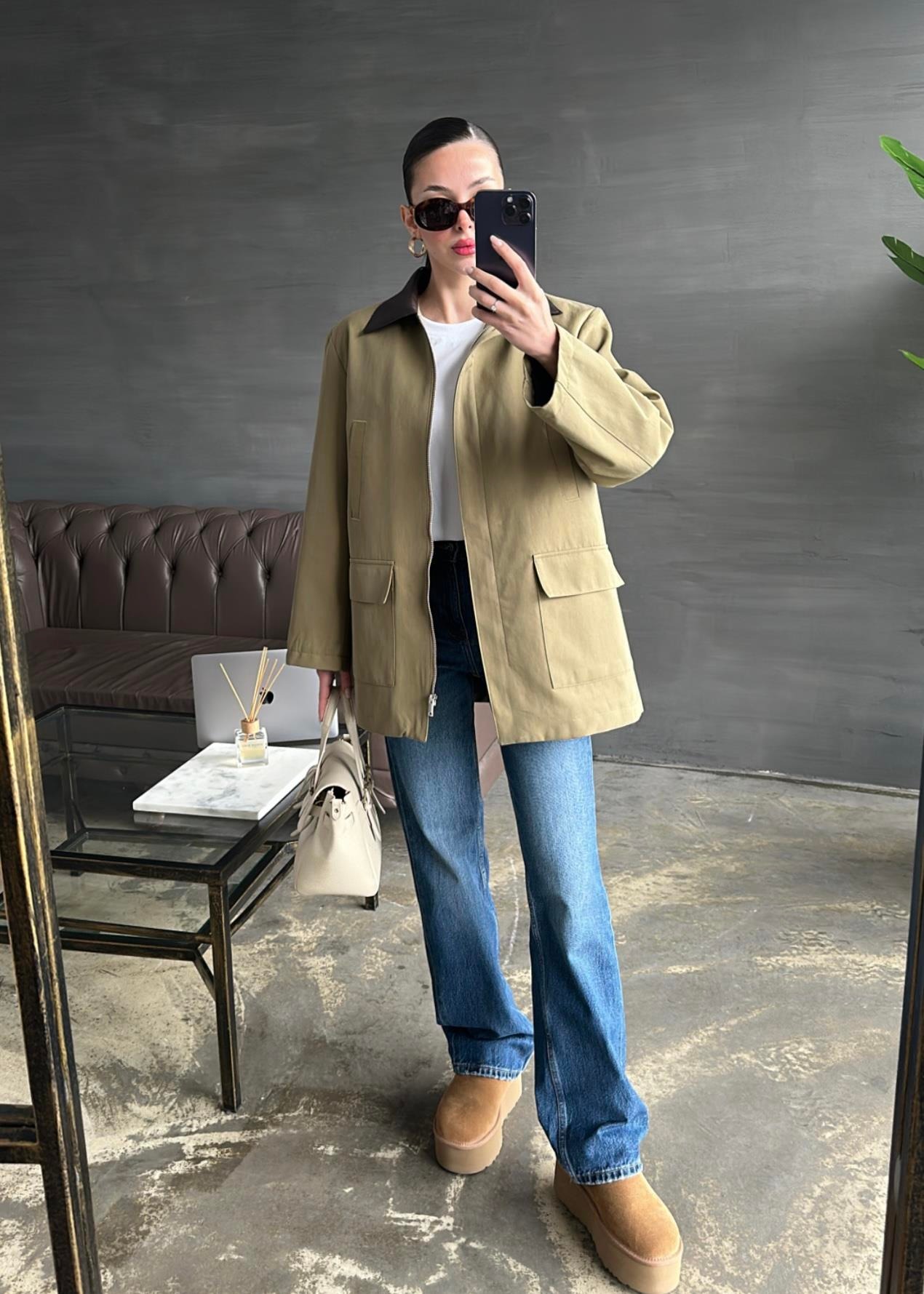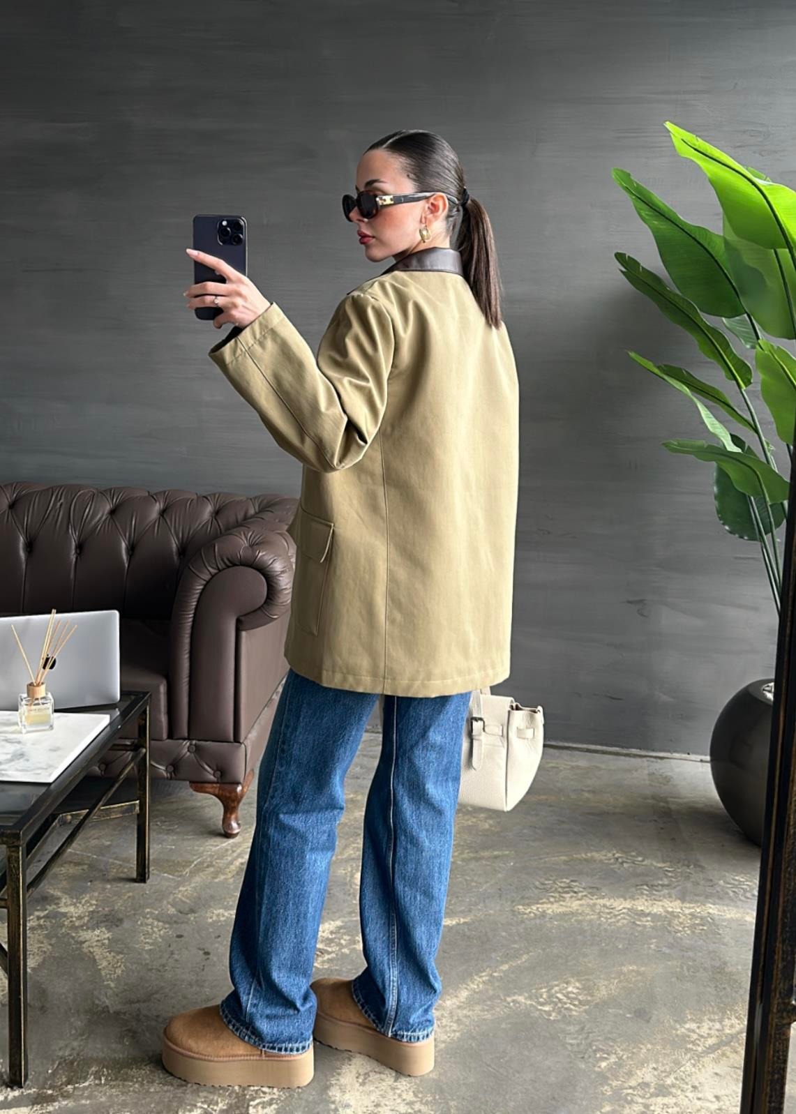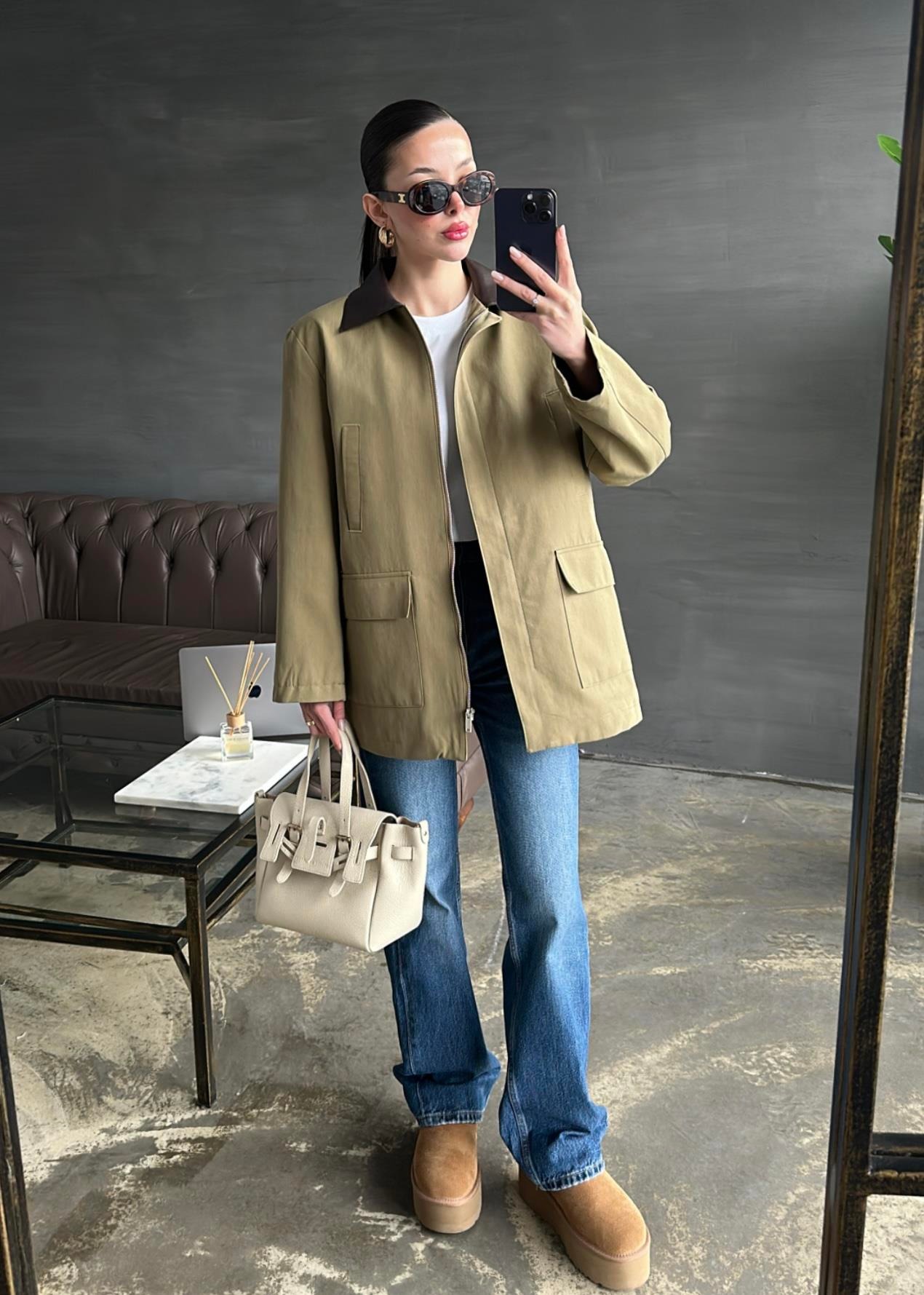 Yakası Deri Detaylı Parka HAKİ