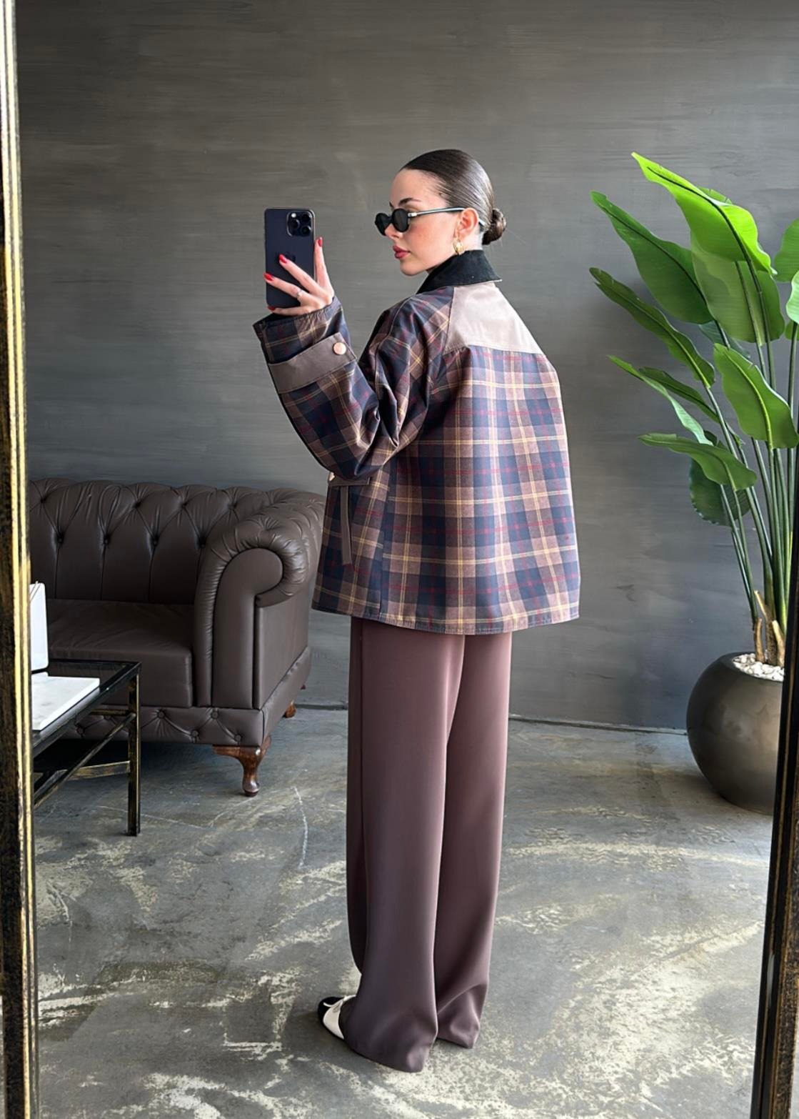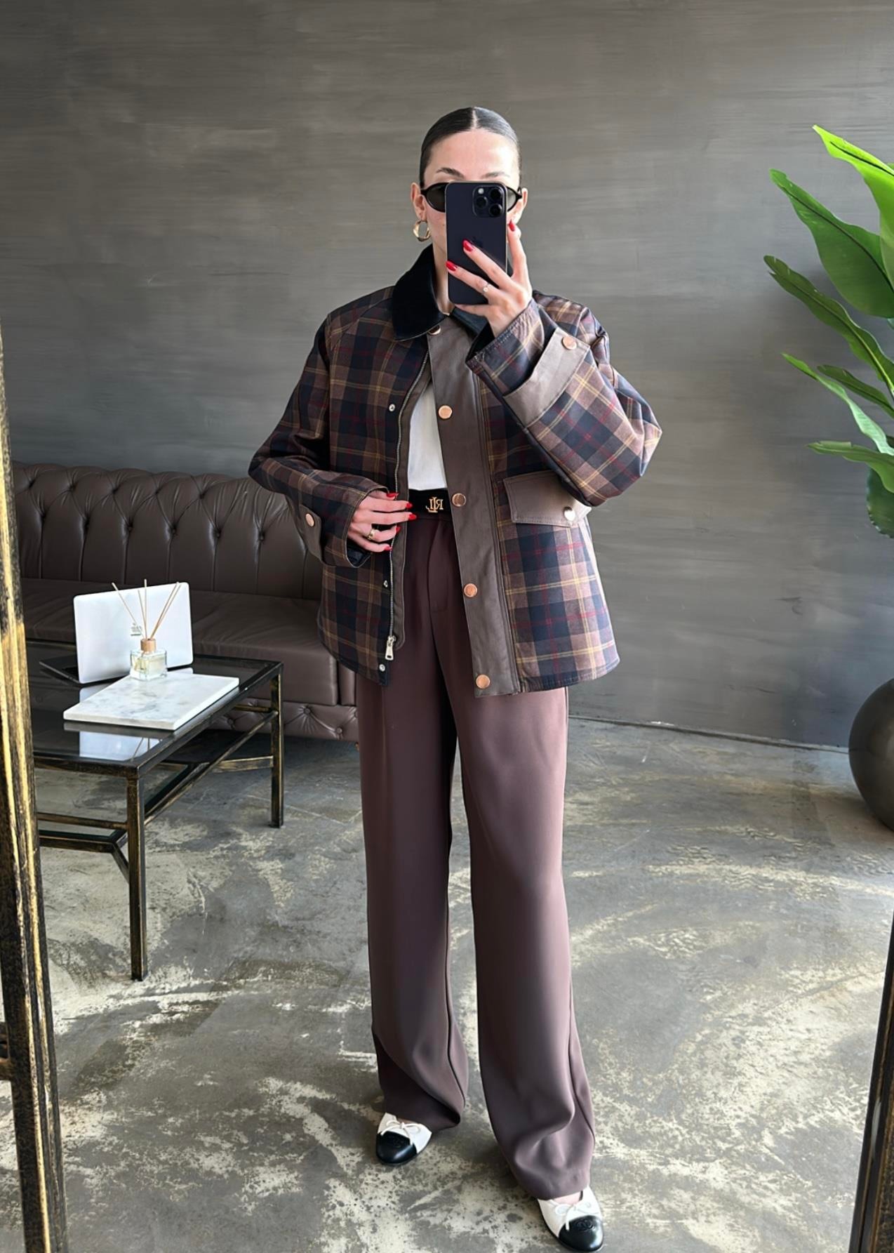 Çekimde S Beden kullanılmıştır. Tam kalıptır, kendi bedeninizi alabilirsiniz. Fermuarlıdır, içi ekose astarlıdır.