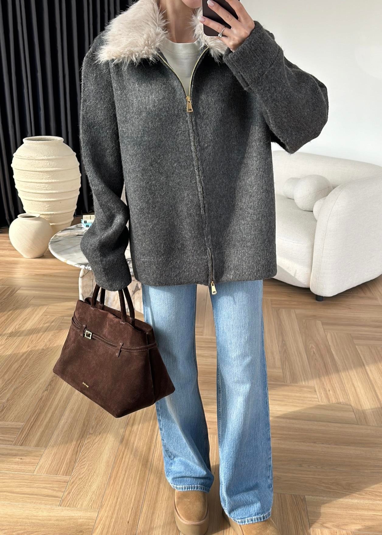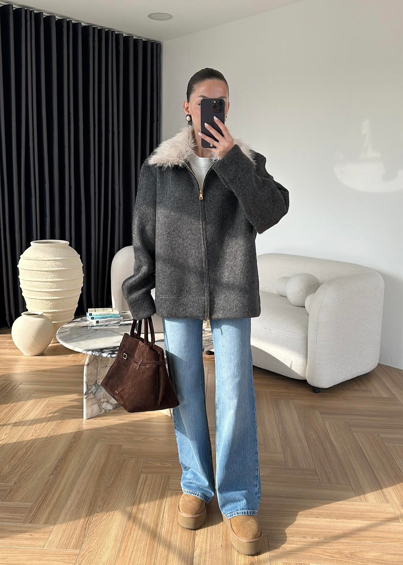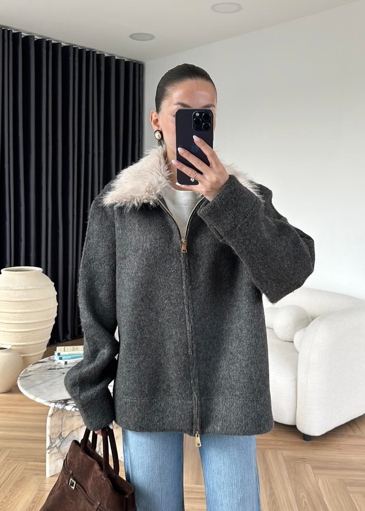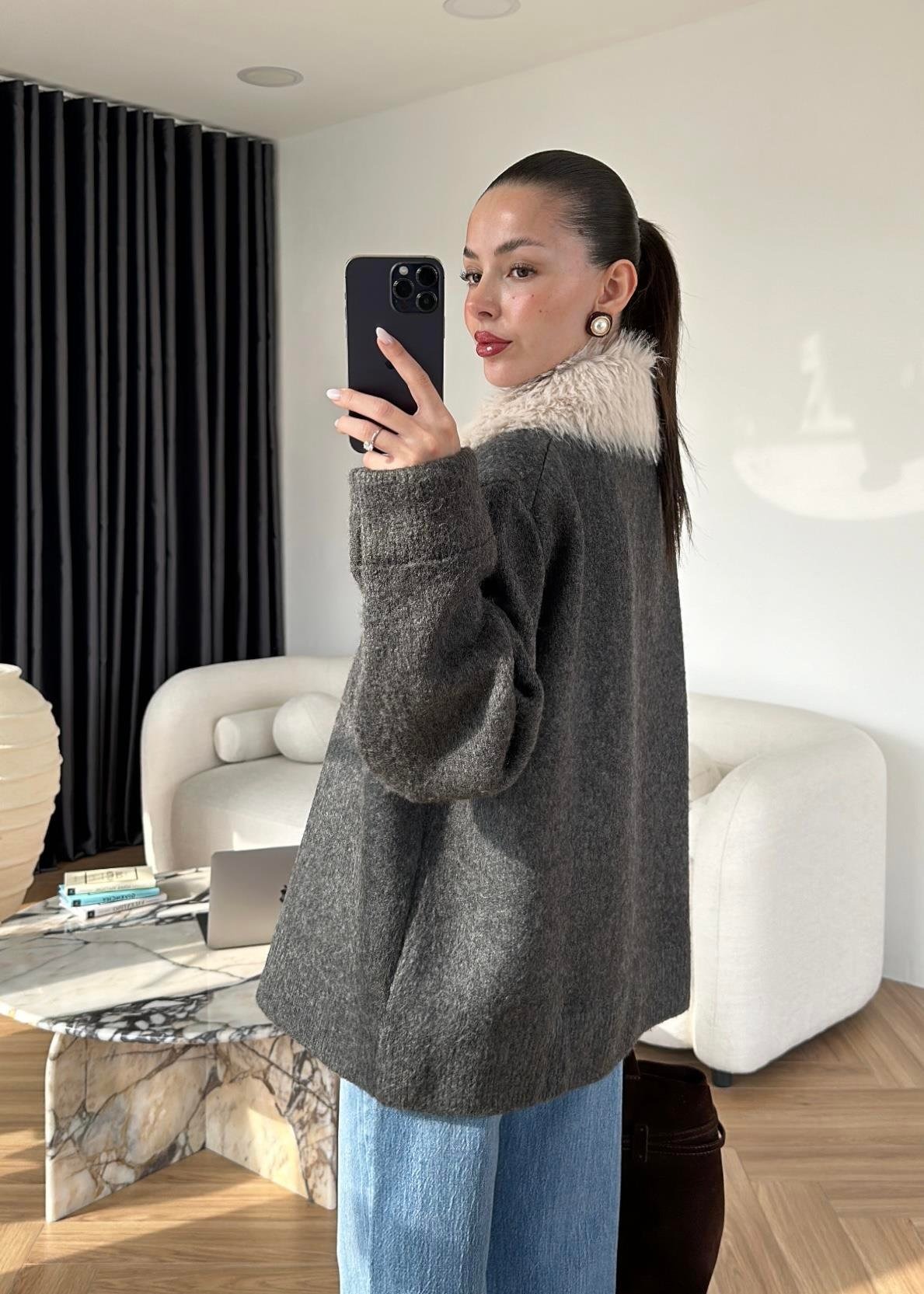 Çıkarılabilir Kürklü Hırka ANTRASİT