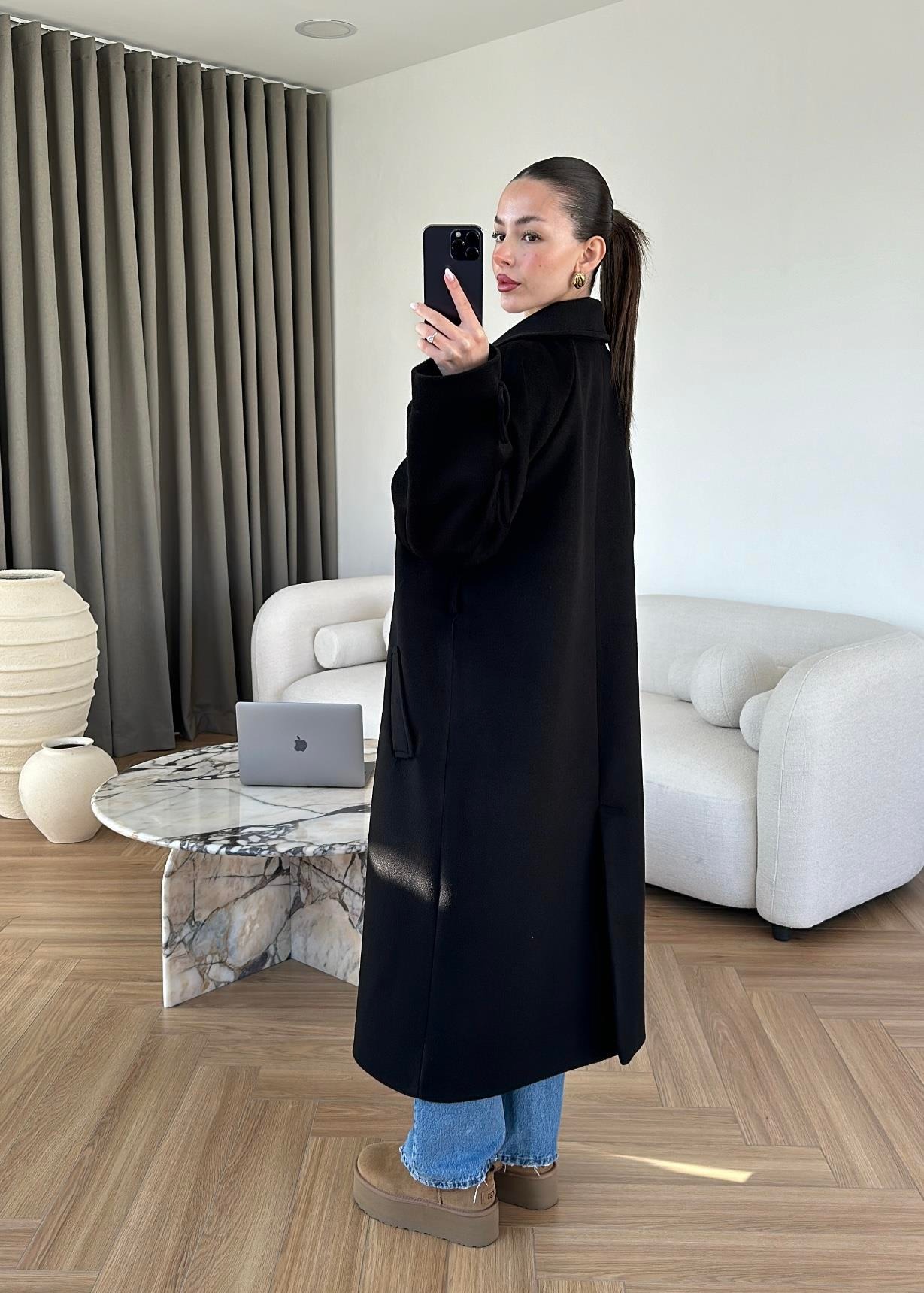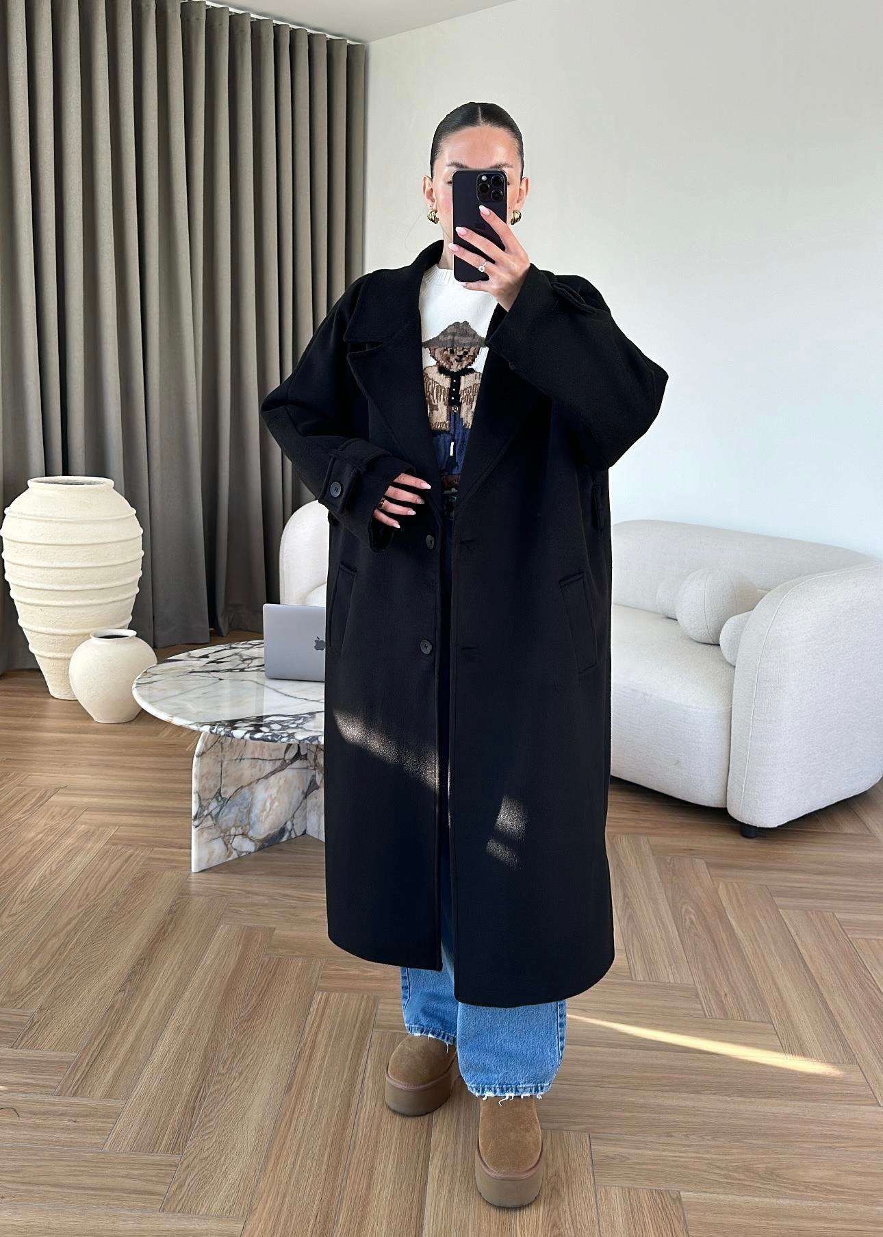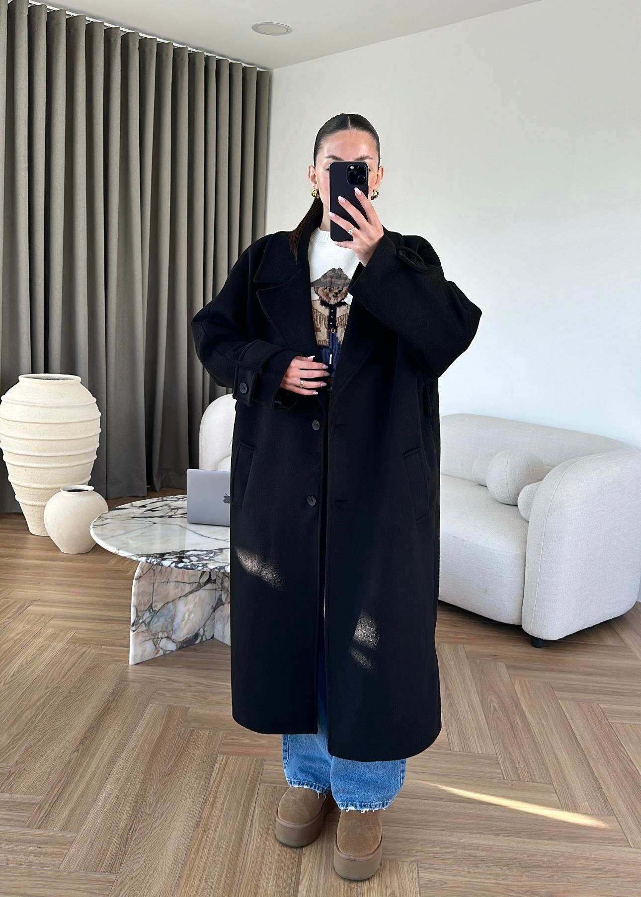 İki Düğmeli Kuşaklı Kaban SİYAH