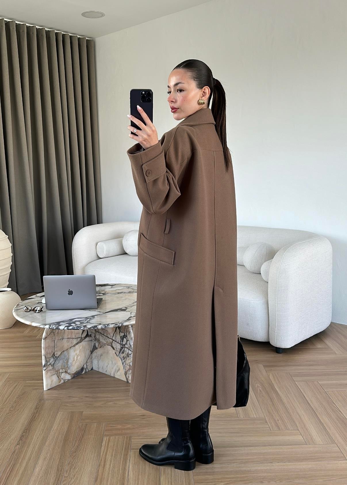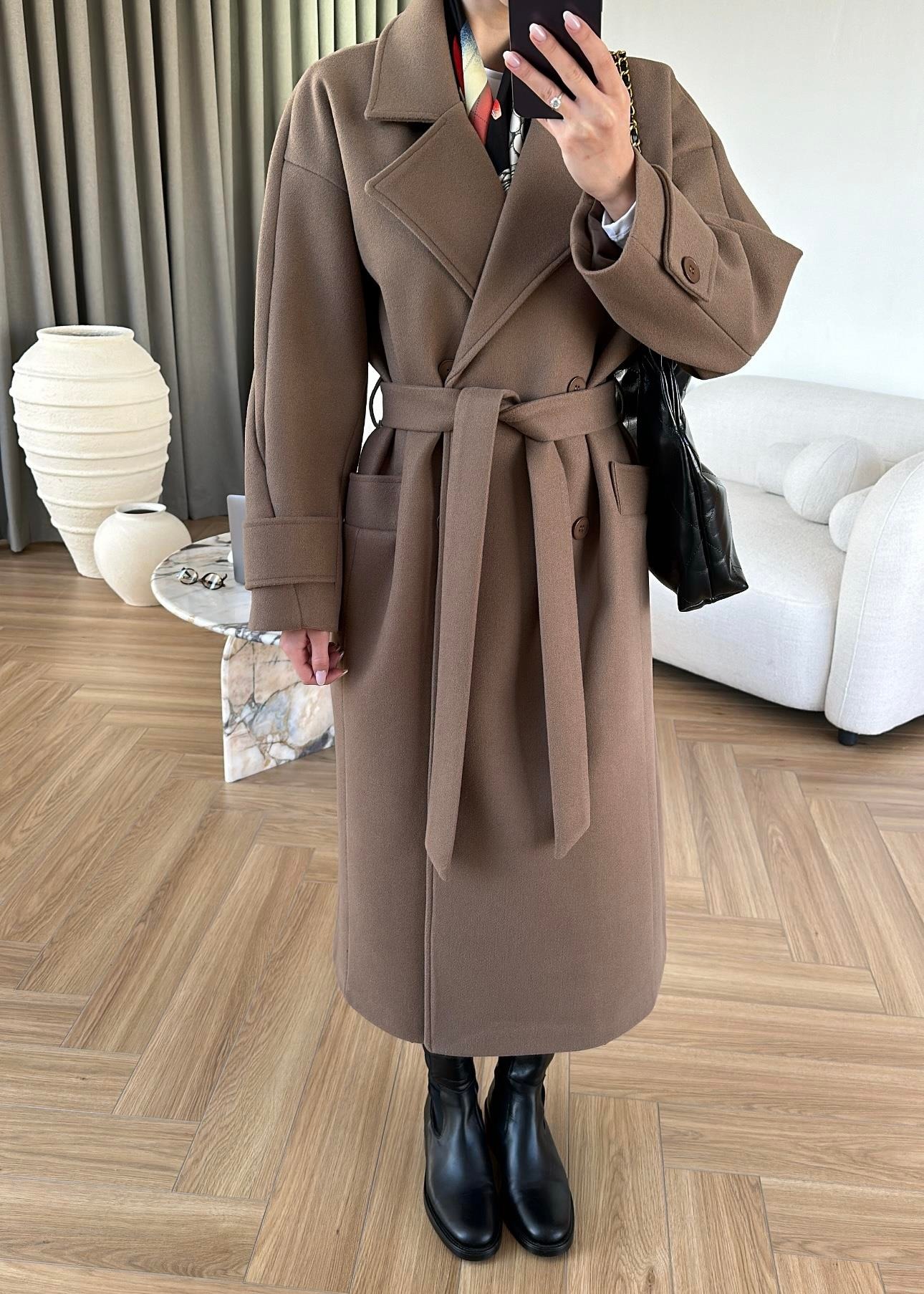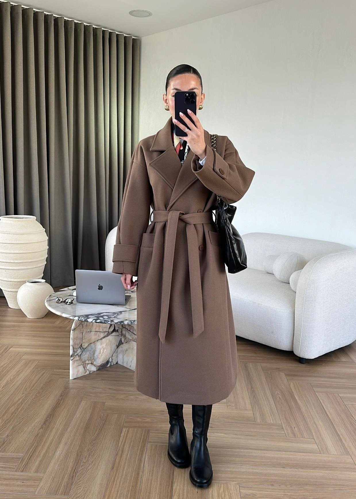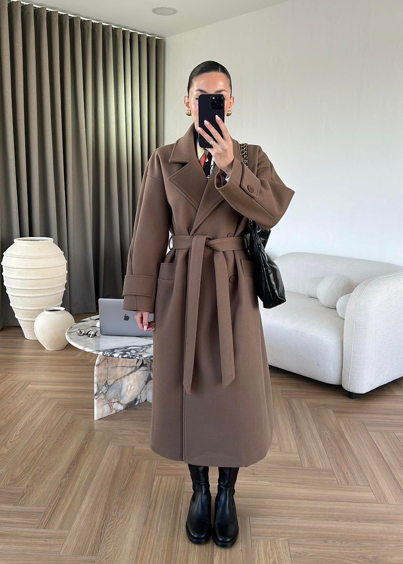 İki Düğmeli Kuşaklı Kaban AÇIK KAHVE