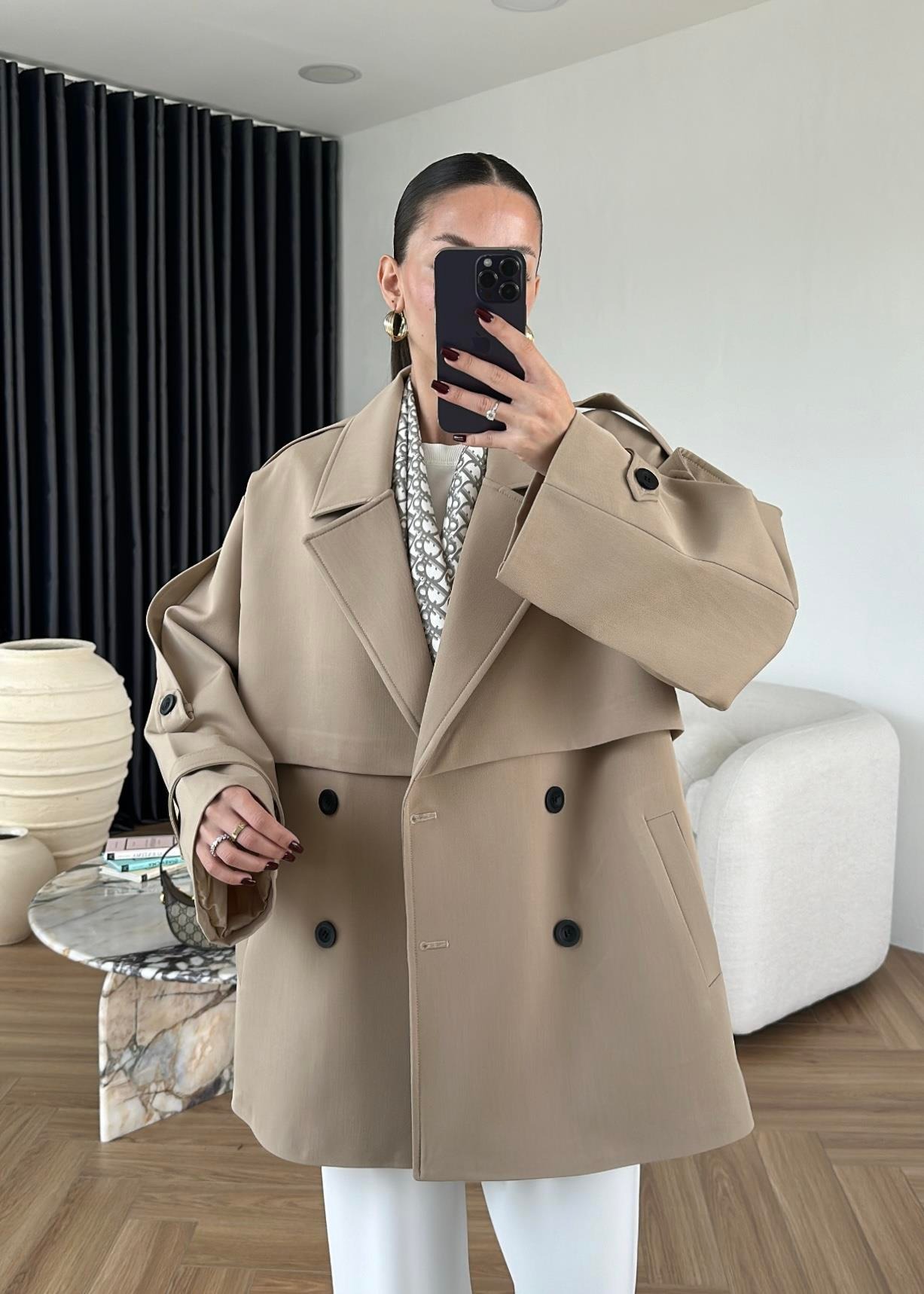 Çekimde S Beden kullanılmıştır,Astarlı kuşaklı ve ceplidir.